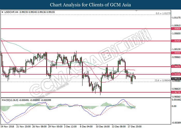 USDCHF, H4: USDCHF telah didagang dengan lebih rendah selepas ia berundur dari tahap rintangan 0.9930. MACD yang memaparkan isyarat bearish mencadangkan pasangan ini untuk didagang dengan lebih rendah bagi jangka pendek dan menguji semula di paras berhampiran 0.9905.