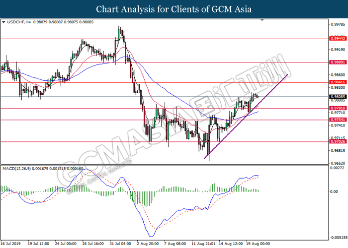 USDCHF, H4: USDCHF telah didagang dengan lebih rendah berikutan dengan pengunduran dari tahap paras tingginya. MACD yang memaparkan penyusutan pada momentum bullish mencadangkan pasangan ini untuk melanjutkan pengundurannya ke arah tahap sokongan 0.9780.