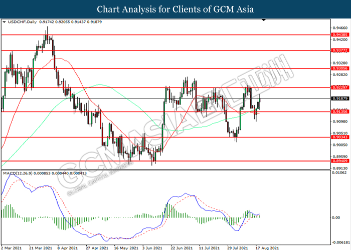 USDCHF, Daily: USDCHF telah didagang dengan lebih tinggi selepas ia melantun dari tahap sokongan 0.9135. MACD yang memaparkan momentum bullish mencadangkan pasangan ini untuk melanjutkan keuntungannya ke arah tahap rintangan 0.9230.