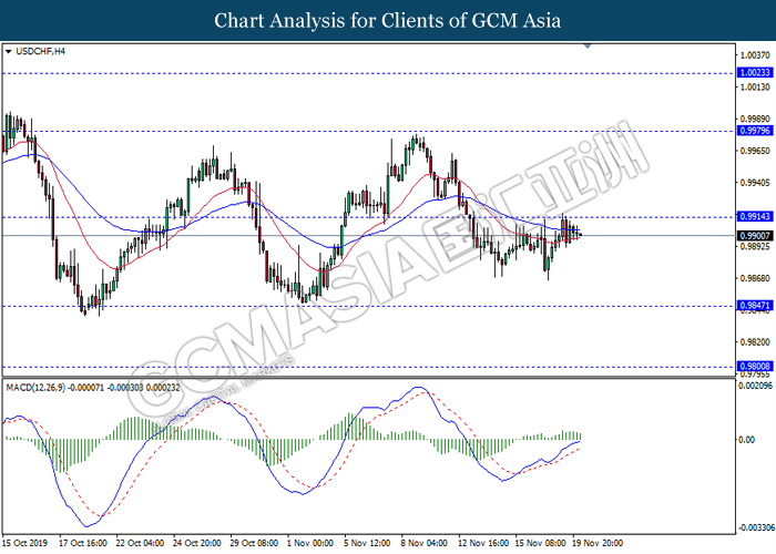 USDCHF, H4: USDCHF telah didagang dengan lebih rendah berikutan dengan pengunduran dari tahap rintangan 0.9915. MACD yang memaparkan isyarat momentum bullish yang telah berkurangan mencadangkan pasangan ini untuk melanjutkan pengundurannya ke arah tahap sokongan 0.9845.