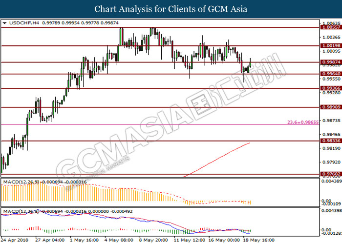 USDCHF, H4: USDCHF telah didagang dengan lebih tinggi setelah ia melantun dari tahap sokongan di 0.9960. Garisan isyarat MACD yang menunjukkan kelemahan dalam momentum menurun memberi cadangan kepada pasangan tersebut untuk melanjutkan kenaikan sekiranya ia berjaya memecah tahap rintangan di 0.9990.