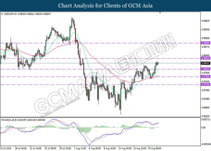 USDCHF, H4: USDCHF telah didagang dengan lebih tinggi sementara menguji berdekatan tahap rintangan 0.9840. MACD yang memaparkan momentum bullish mencadangkan pasangan ini untuk melanjutkan kenaikannya selepas ia berjaya untuk memecahkan pada tahap rintangan tersebut.