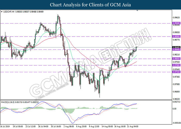 USDCHF, H4: USDCHF telah didagang dengan lebih tinggi berikutan dengan pemecahan dari tahap rintangan sebelumnya di 0.9840. MACD yang memaparkan momentum bullish yang berterusan mencadangkan pasangan ini untuk melanjutkan keuntungannya ke arah tahap rintangan 0.9890.