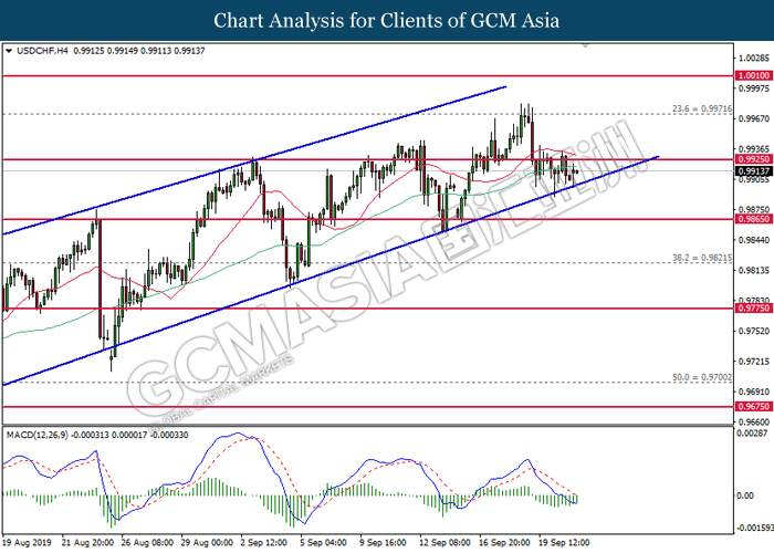 USDCHF, H4: USDCHF telah didagang dengan lebih rendah di dalam formasi saluran menaik. MACD yang memaparkan penyusutan pada momentum menurun mencadangkan pasangan ini untuk didagang dengan lebih tinggi bagi jangka pendek.
