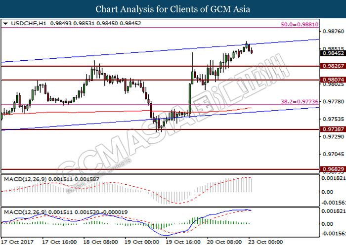 USDCHF, H1: USDCHF telah didagang dengan lebih rendah setelah ia berundur dari garisan trend pada saluran menaik. Pembentukan candlestick engulfing dan silang kematian yang dipaparkan oleh garisan isyarat MACD memberi cadangan kepada pasangan untuk mengalami pembetulan teknikal secara jangka masa pendek untuk melanjutkan kerugian ke arah tahap sokongan di 0.9825.