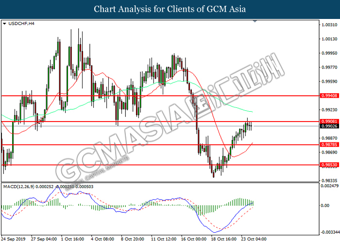 USDCHF, H4: USDCHF telah didagang dengan lebih tinggi sementara kini menguji di tahap rintangan 0.9910. Namun, MACD yang memaparkan momentum bullish yang berkurangan mencadangkan pasangan ini untuk mengalami pembetulan teknikal bagi jangka pendek.