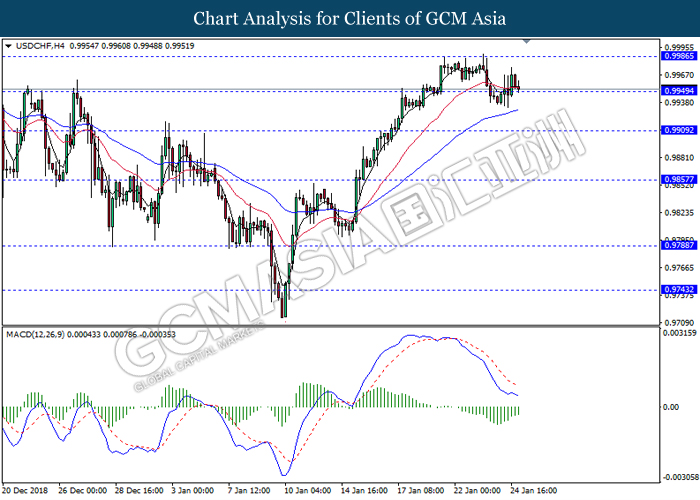 USDCHF, H4: USDCHF telah didagang dengan lebih rendah sementara ia sedang menguji tahap sokongan 0.9950. Namun, MACD yang memaparkan isyarat momentum bearish yang telah berkurangan mencadangkan pasangan ini untuk didagang dengan lebih tinggi ke arah tahap rintangan 0.9985.
