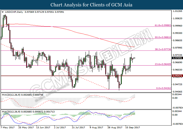 USDCHF, Daily: USDCHF telah didagang dengan lebih tinggi selepas memecahkan tahap rintangan di 0.9640. Garisan isyarat MACD yang bersusur di atas garisan neutral memberi cadangan kepada pasangan tersebut untuk melanjutkan momentum bagi berdagang dengan lebih tinggi ke arah tahap rintangan yang seterusnya di 0.9770.