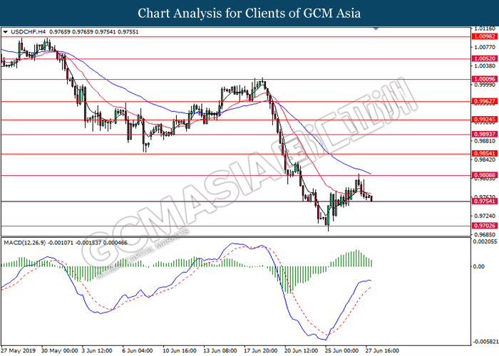 USDCHF, H4: USDCHF telah didagang dengan lebih rendah sementara menguji pada tahap sokongan di 0.9755. MACD yang menunjukkan penyusutan pada momentum bullish mencadangkan pasangan ini untuk melanjutkan kerugiannya selepas ia berjaya untuk memecahkan pada tahap sokongan tersebut.