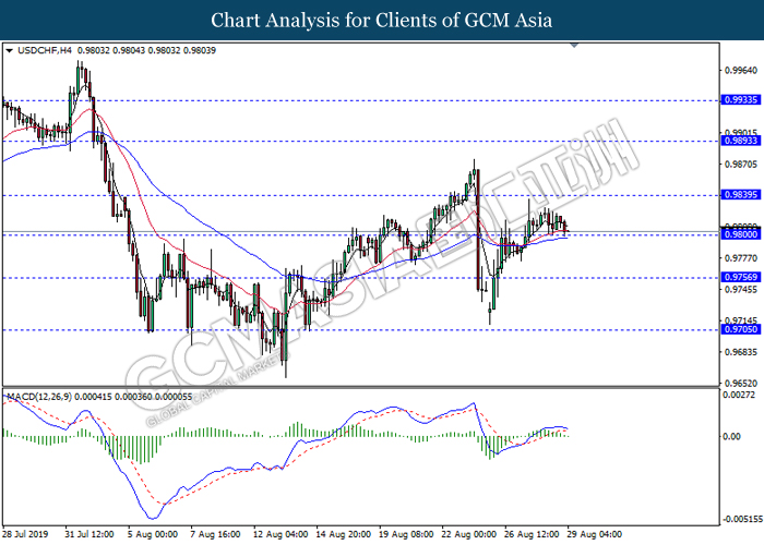 USDCHF, H4: USDCHF telah didagang dengan lebih rendah sementara ia sedang menguji tahap sokongan 0.9800. MACD yang memaparkan isyarat momentum bearish mencadangkan pasangan ini untuk melanjutkan keuntungannya selepas ia memecah tahap sokongan tersebut.
