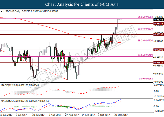 USDCHF, Daily: USDCHF telah didagang dengan lebih rendah setelah ia gagal untuk memecah tahap rintangan di 0.9990. Pembentukan lilin pin bar dan histogram MACD yang menyusut ke arah garisan neutral memberi isyarat momentum bullish yang semakin menurun, seterusnya memberi cadangan kepada pasangan tersebut untuk melalui pembetulan teknikal secara jangka masa pendek dengan melanjutkan kerugian ke arah tahap sokongan di 0.9940.