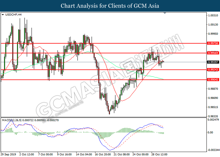 USDCHF, H4: USDCHF telah didagang dengan lebih tinggi selepas ia melantun dari tahap sokongan 0.9925. Namun, MACD yang memaparkan momentum bearish mencadangkan pasangan ini untuk mengalami pembetulan teknikal.