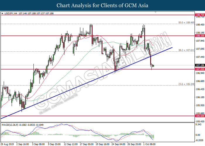 USDJPY, H4: USDJPY telah didagang dengan lebih rendah sementara kini menguji di tahap sokongan 107.05. MACD yang memaparkan isyarat bearish mencadangkan pasangan ini untuk meneruskan kerugiannya selepas ia ditutup di bawah 107.05.