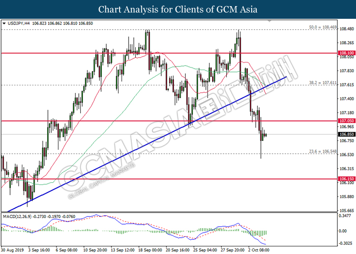 USDJPY, H4: USDJPY telah didagang dengan lebih tinggi selepas ia melantun dari tahap sokongan 106.55. MACD yang memaparkan penyusutan pada momentum menurun mencadangkan pasangan ini untuk didagang dengan lebih rendah bagi jangka pendek sebagai pembetulan teknikal.