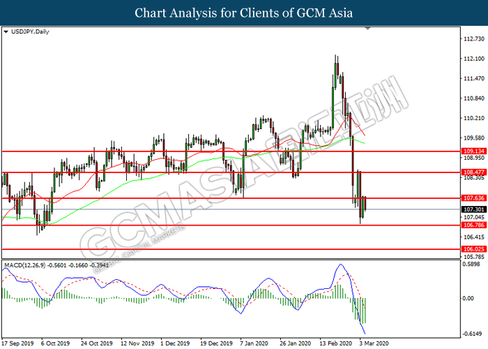 USDJPY, Daily: USDJPY telah didagang dengan lebih rendah selepas ia berundur dari tahap rintangan 107.65. Namun, MACD yang memaparkan momentum bearish yang berkurangan mencadangkan pasangan ini untuk mengalami pembetulan teknikal bagi jangka pendek.