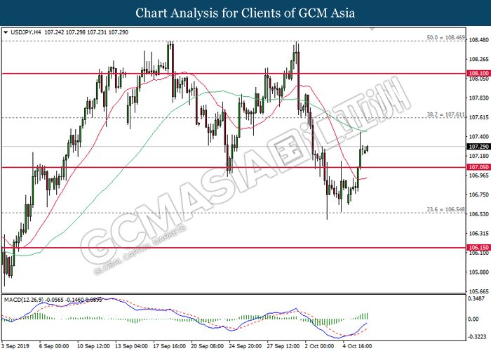 USDJPY, H4: USDJPY telah didagang dengan lebih tinggi selepas ia memecahkan sasaran di 107.05. MACD yang memaparkan isyarat bullish mencadangkan pasangan ini untuk meningkat dan menuju ke arah 107.40.
