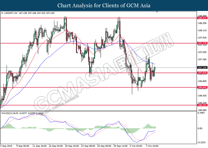 USDJPY, H4: USDJPY telah didagang dengan lebih tinggi selepas ia memecah tahap rintangan  sebelumnya 107.00. MACD yang memaparkan isyarat bullish mencadangkan pasangan ini untuk melanjutkan keuntungannya ke arah tahap rintangan 107.80.