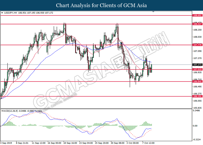 USDJPY, H4: USDJPY telah didagang dengan lebih tinggi sementara ia sedang menguji tahap rintangan 107.00. MACD yang memaparkan isyarat bullish mencadangkan pasangan ini untuk melanjutkan keuntungannya selepas ia berjaya memecah tahap rintangan 107.00.