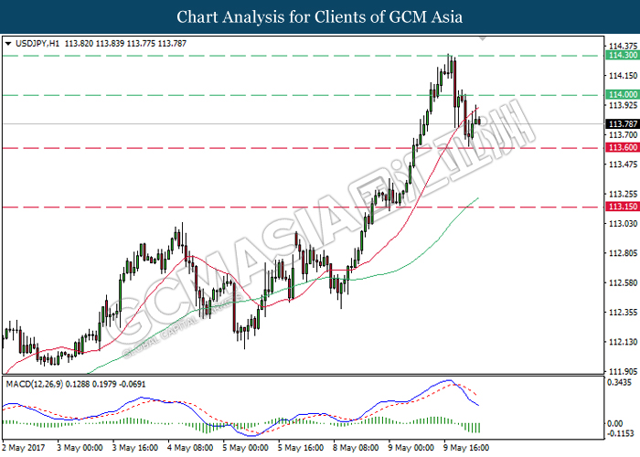 USDJPY, H1: USDJPY didagang dengan lebih rendah selepas ia berundur dari paras tinggi 114.30. Merujuk kepada petunjuk MACD histogram yang memaparkan isyarat dan momentum, USDJPY dicadangkan untuk didagang dengan lebih rendah ke sasaran tahap sokongan di 113.60.