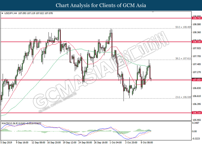 USDJPY, H4: USDJPY telah didagang dengan lebih rendah sementara kini menguji di tahap sokongan 107.05. MACD yang memaparkan penyusutan pada momentum menaik mencadangkan pasangan ini untuk meneruskan kerugiannya selepas pemecahan berlaku di tahap sokongan tersebut.