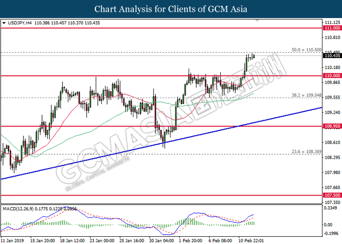 USDJPY, H4: USDJPY telah didagang dengan lebih tinggi sementara kini menguji di tahap rintangan 110.50. MACD yang memaparkan isyarat bullish mencadangkan pasangan ini untuk meneruskan keuntungannya selepas pemecahan berlaku di 110.50.