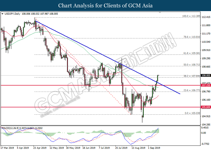 USDJPY, Daily: USDJPY telah didagang dengan lebih tinggi selepas ia memecahkan garisan trend menurun. MACD yang memaparkan isyarat bullish mencadangkan pasangan ini untuk meningkat dan menuju ke arah 108.70.
