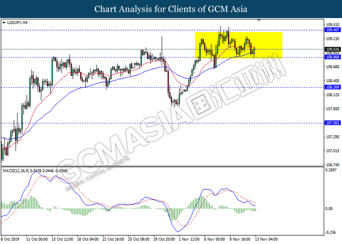 USDJPY, H4: USDJPY kekal didagang dalam saluran sisi berikutan dengan lantunan dari tahap sokongan 108.85 baru-baru ini. Namun, MACD yang memaparkan isyarat momentum bearish yang berkurangan mencadangkan pasangan ini untuk melanjutkan lantunannya dalam jangka pendek ke arah tahap rintangan 109.40.