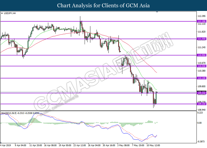 USDJPY, H4: USDJPY telah didagang dengan lebih tinggi sementara menguji berdekatan tahap rintangan di 109.55. MACD yang menunjukkan isyarat bias bullish mencadangkan pasangan ini untuk melanjutkan keuntungannya selepas ia berjaya untuk menutupkan lilinnya di atas tahap rintangan tersebut.