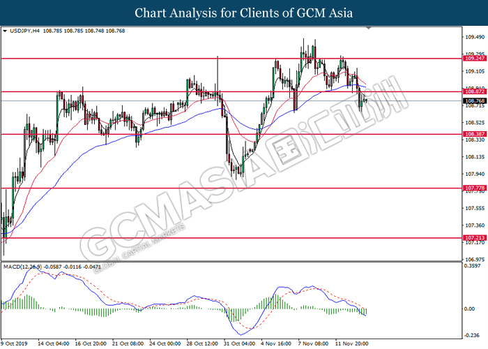USDJPY, H4: USDJPY telah didagang dengan lebih tinggi selepas ia melantun daripada tahap rendah. Namun, MACD yang memaparkan momentum bearish mencadangkan pasangan ini untuk mengalami pembetulan teknikal bagi jangka masa yang pendek.