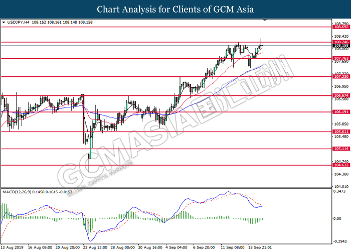 USDJPY, H4: USDJPY telah didagang dengan lebih tinggi sementara ia sedang menguji tahap rintangan 108.25. MACD yang memaparkan penyusutan pada momentum menurun mencadangkan pasangan ini untuk didagang dengan lebih tinggi selepas ia berjaya memecah tahap rintangan 108.25.
