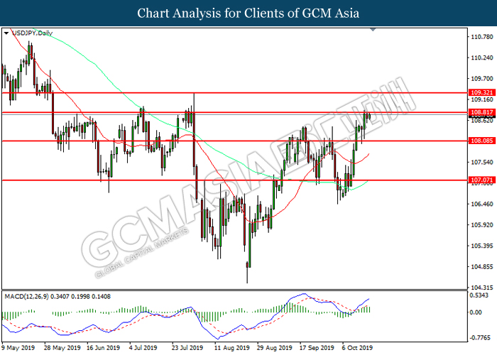 USDJPY, Daily: USDJPY telah didagang dengan lebih tinggi sementara kini menguji di tahap rintangan 108.80. MACD yang memaparkan momentum bullish mencadangkan pasangan ini untuk melanjutkan keuntungannya selepas ia memecah tahap rintangan tersebut.