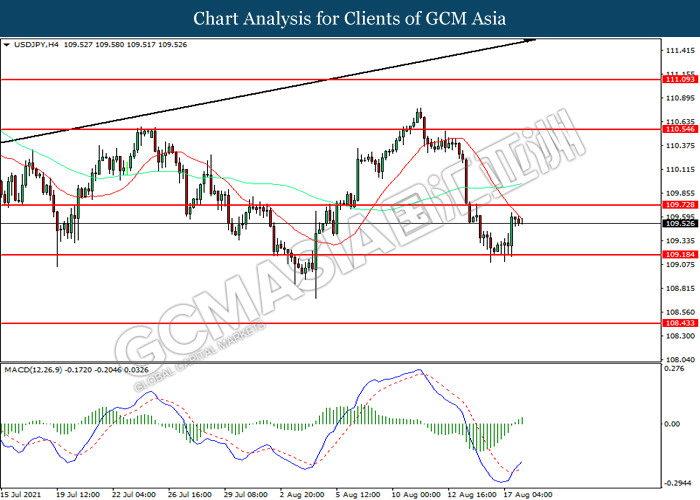 USDJPY, H4: USDJPY telah didagang dengan lebih tinggi selepas ia melantun dari tahap sokongan 109.20. MACD yang memaparkan momentum bullish mencadangkan pasangan ini untuk melanjutkna keuntungannya ke arah tahap rintangan 109.75.