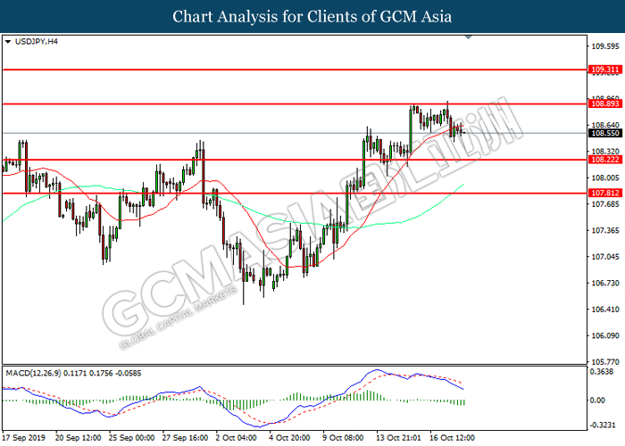 USDJPY, H4: USDJPY telah didagang dengan lebih rendah selepas ia berundur dari tahap rintangan 108.90. MACD yang memaparkan isyarat bearish bias mencadangkan pasangan ini untuk melanjutkan kerugiannya kea rah tahap sokongan 108.20.