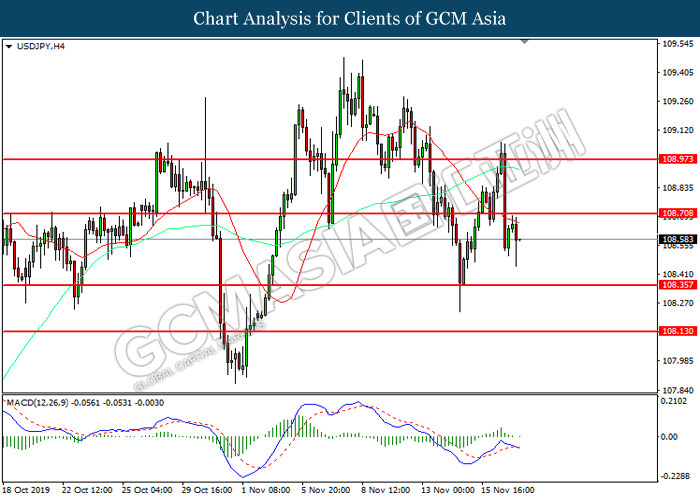 USDJPY, H4: USDJPY telah didagang dengan lebih rendah selepas ia memecah tahap sokongan terdahulu 108.70. MACD yang memaparkan momentum bullish yang berkurangan mencadangkan pasangan ini untuk melanjutkan kerugiannya ke arah tahap sokongan 108.35.