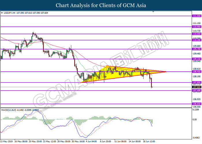 USDJPY, H4: USDJPY telah didagang dengan lebih rendah berikutan dengan pemecahan dari tahap sokongan sebelumnya di 107.85. MACD yang memaparkan momentum bias bearish mencadangkan pasangan ini untuk melanjutkan kerugiannya ke arah tahap sokongan di 107.40.