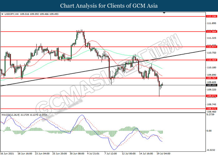 USDJPY, H4: USDJPY telah didagang dengan lebih tinggi selepas ia melantun dari tahap sokongan 109.05. MACD yang memaparkan momentum bearish mencadangkan pasangan ini untuk melanjutkan keuntungannya ke arah tahap rintangan 109.75.