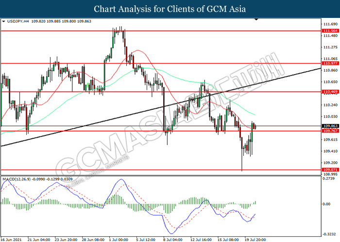 USDJPY, H4: USDJPY telah didagang dengan lebih tinggi selepas ia memecah tahap rintangan terdahulu 108.75. MACD yang memaparkan momentum bullish mencadangkan pasangan ini untuk melanjutkan keuntungannya ke arah tahap rintangan 110.45.