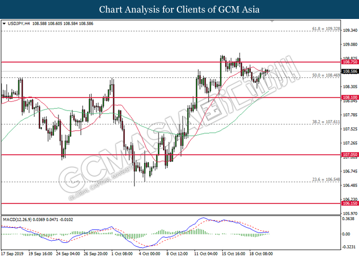 USDJPY, H4: USDJPY telah didagang dengan lebih tinggi selepas ia melantun dari paras bawahnya. MACD yang mula untuk membentuk isyarat bullish mencadangkan pasangan ini untuk didagang dengan lebih tinggi bagi jangka pendek.
