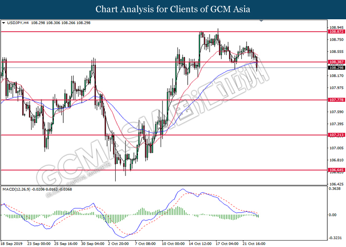 USDJPY, H4: USDJPY telah didagang dengan lebih rendah selepas ia berjaya memecah tahap sokongan 108.40. MACD yang memaparkan momentum bearish mencadangkan pasangan ini untuk melanjutkan kerugiannya ke arah tahap sokongan seterusnya di 107.80.