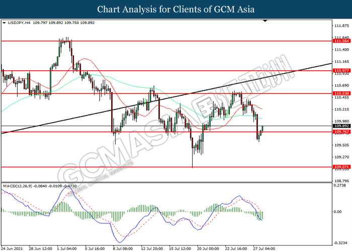 USDJPY, H4: USDJPY telah didagang dengan lebih tinggi selepas ia melantun dari tahap sokongan 109.75. MACD yang memaparkan momentum bearish yang berkurangan mencadangkan pasangan ini untuk melanjutkan keuntungannya ke arah tahap rintangan 110.55.