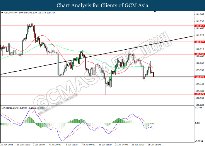 USDJPY, H4: USDJPY telah didagang dengan lebih rendah sementara kini menguji di tahap sokongan 109.70. MACD yang memaparkan momentum bearish mencadangkan pasangan ini untuk melanjutkan kerugiannya selepas ia memecah tahap sokongan tersebut.