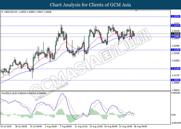 USDCAD, H4: USDCAD telah didagang dengan lebih tinggi susulan dengan lantunan dari tahap sokongan 1.3290. MACD yang menunjukkan penyusutan pada momentum bearish mencadangkan pasangan ini untuk melanjutkan lantunannya ke arah tahap rintangan 1.3335.