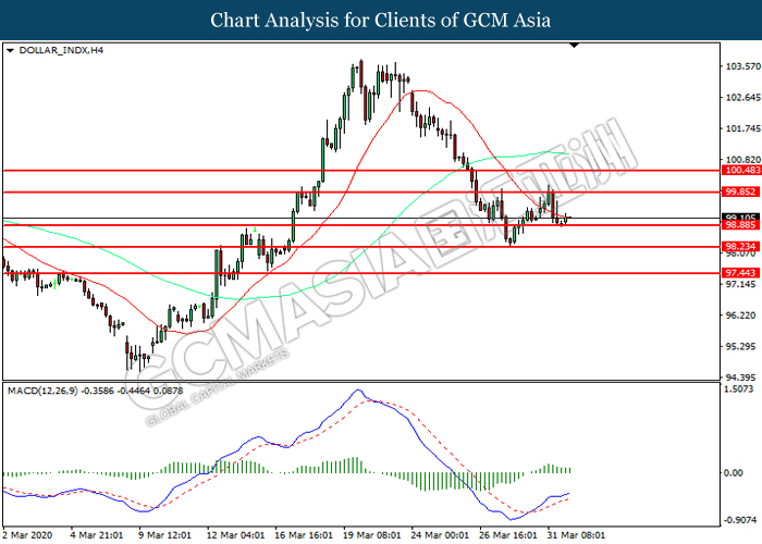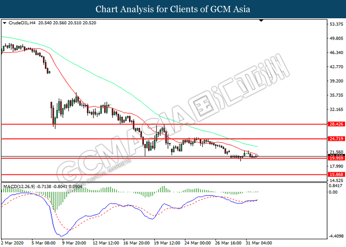 CrudeOIL, H4: Harga minyak mentah telah didagang dengan lebih rendah sementara kini menguji di tahap sokongan 19.95. Namun, MACD yang memaparkan momentum bullish mencadangkan komoditi ini untuk mengalami pembetulan teknikal bagi jangka pendek.