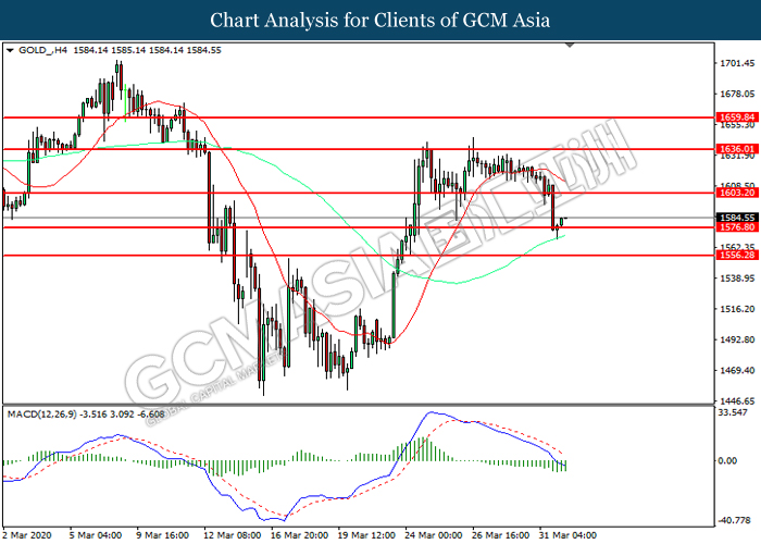 GOLD_, H4: Harga emas telah didagang dengan leibh tinggi selepas ia melantun dari tahap sokongan 1576.80. MACD yang memaparkan momentum bearish yang berkurangan mencadangkan komoditi ini untuk melanjutkan keuntungannya ke arah tahap rintangan 1603.20.