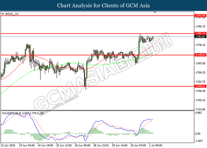 GOLD_, H1: Harga emas telah didagang dengan lebih tinggi sementara kini menguji di tahap rintangan 1785.75. Namun, MACD yang memaparkan momentum bullish yang berkurangan mencadangkan komoditi ini untuk mengalami pembetulan teknikal bagi jangka pendek.