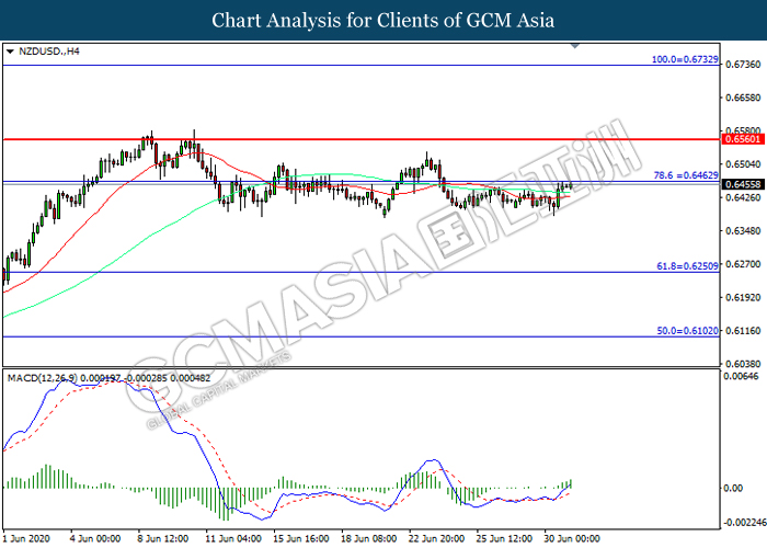 NZDUSD, H4: NZDUSD telah didagang dalam satu saluran sisi sementara kini menguji di tahap rintangan 0.6465. MACD yang memaparkan momentum bullish mencadangkan pasangan ini untuk melanjutkan keuntungannya selepas ia memecah tahap rintangan tersebut.