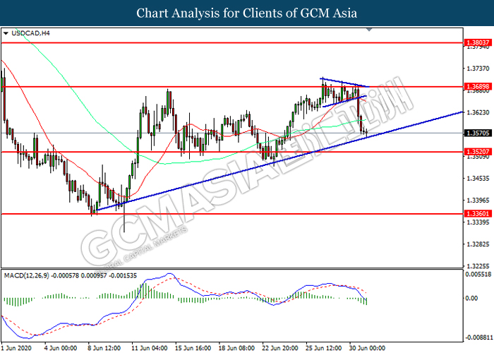 USDCAD, H4: USDCAD telah didagang dengan lebih rendah selepas ia berundur dari tahap rintangan 1.3690. MACD yang memaparkan momentum bearish mencadangkan pasangan ini untuk melanjutkan kerugiannya ke arah tahap sokongan 1.3520.