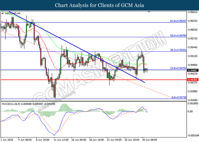 USDCHF, H4: USDCHF telah didagang dengan lebih rendah sementara kini menguji di tahap sokongan 0.9470. MACD yang memaparkan momentum bearish mencadangkan pasangan ini untuk melanjutkan kerugiannya selepas ia memecah tahap sokongan tersebut.