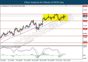 CrudeOIL, H4: Harga minyak mentah kekal didagang dalam saluran sisi sementara ia sedang menguji berhampiran dengan tahap rintangan 74.20. Namun, MACD yang memaparkan isyarat bias bullish dengan formasi silang emas mencadangkan komoditi ini untuk melanjutkan keuntungannya selepas ia memecah tahap rintangan tersebut.