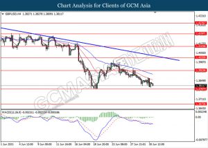 GBPUSD, H4: GBPUSD telah didagang dengan lebih rendah sementara ia sedang menguji tahap sokongan 1.3785. MACD yang memaparkan isyarat momentum bearish mencadangkan pasangan ini untuk melanjutkan keuntungannya selepas ia memecah tahap sokongan tersebut.